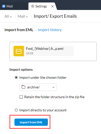 - Click on Choose file and browse an EML file or a Zip file containing EML files.