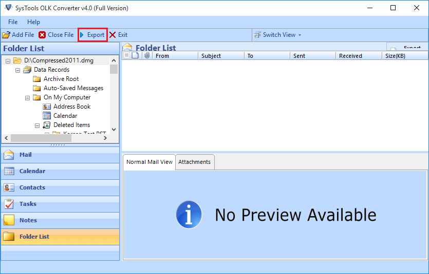 If you have complete Mac Outlook database in then this converter software provides an option to convert .dmg file of OLK into MBOX file format. Select the .dmg file and view complete data before exporting into MBOX.
